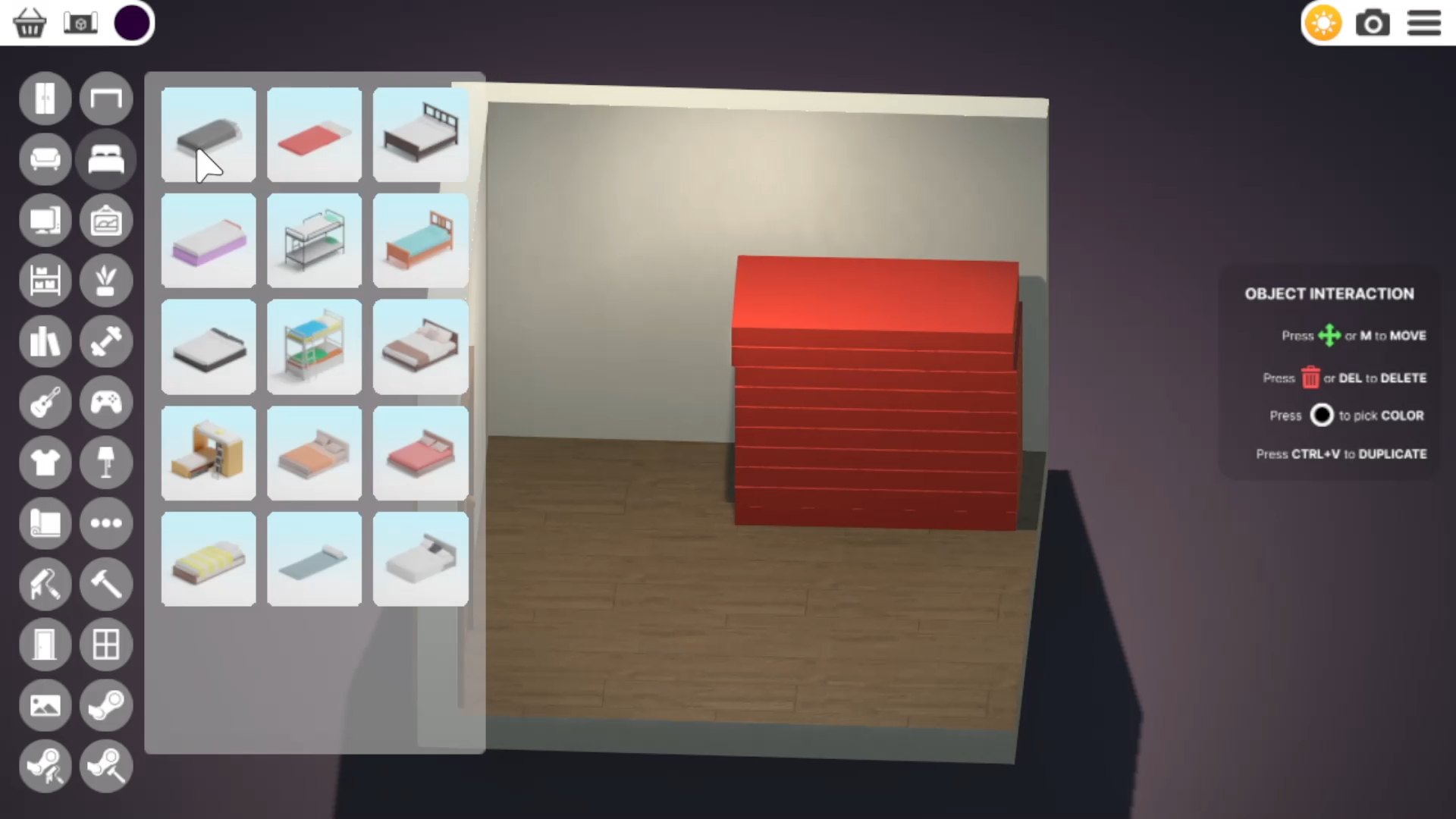 RGB色域里所有的颜色都可以使用。每个家具都可以单独定制颜色。这可以让你创造出各种颜色搭配,还能改变几乎所有物品的颜色,包括:门、窗户、家具、背景。尝试组合不同的颜色和色调来创造出你认为最好看的房间!