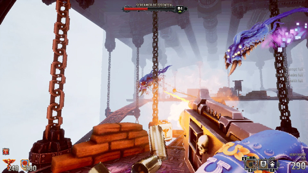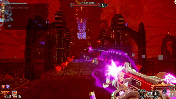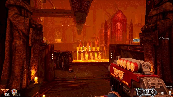 你战斗的环境是走廊、开放环境和一些非常有创意的竞技场的混合体。例如,一个关卡发生在几个城市街区大小的电梯上,有几个关卡几乎完全放弃了战锤 40k的科幻方面,为某种黑暗的幻想地狱景观让路。你将要战斗的许多竞技场通常包含不同级别的海拔和在交火中可以利用的大道。结合您令人印象深刻的弓步前进(允许您穿越大间隙),关卡旨在利用这一点。这些关卡中充斥着大量的弹药、盔甲和临时升级供玩家拾取,临时升级隐藏在整个关卡中,以在短时间内甚至在整个关卡中增强您的武器。