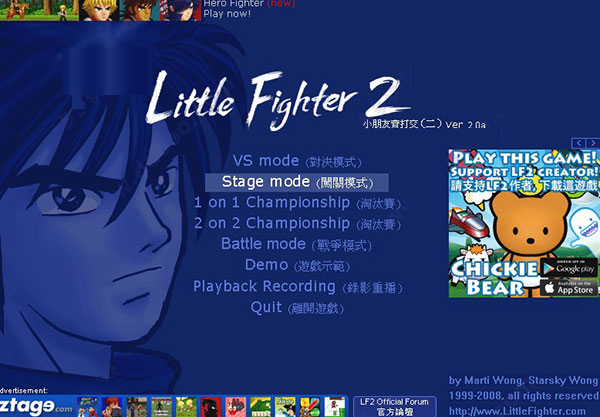 游戏难度共分为容易(Easy),普通( Norma),及困难Di"icut三种级数。此外,只要玩为输入神秘的密码,便可选取最终极的难度-疯狂( CRAZY)级,LF2提供了一个小小的连线功能,让你可以透过输入另一台电脑的|地址跟它进行连线游戏(用Port12345)。