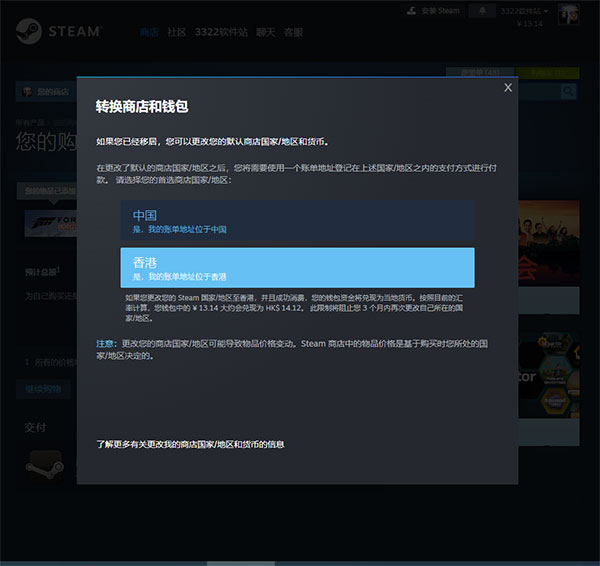 3、点击其它地区后,再次点击此地区,确认转换商店和钱包(此举动并不会改变你的steam账户归属地,玩家也无需购买,地区转换完成后就可以将其移出购物车)。