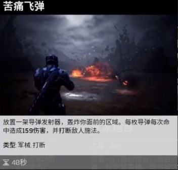 此技能属于AOE,距离和宽度中等,利于对付成群的近战敌人与中近距离掩体后的敌人。