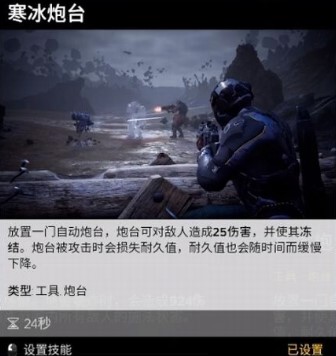 扔出一个炮台,攻击附近敌人并使其冻结,炮台存在耐久值。