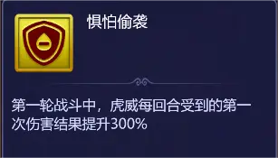惧怕偷袭:第一轮战斗中,虎威每回合受到的第一次伤害结果提升300%。