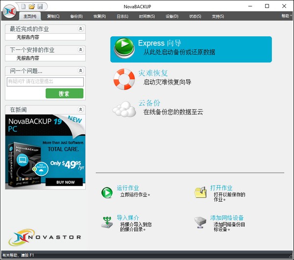 NovaBACKUP官方版是一款界面简洁,专业可靠的PC同步备份软件,NovaBACKUP官方版是笔记本电脑和服务器工作站使用排名第一的PC同步备份软件,此软件的恢复速度提高了4倍,因为新技术可以为您的备份构建索引,从而实现最快的备份导入速度。