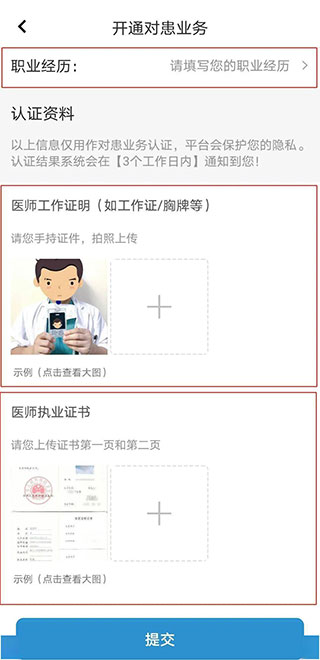 上传“医师工作证明”及“医师执业证书”,点击提交,工作人员会尽快为您审核。