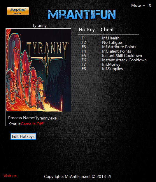 暴君修改器是一款强大的暴君游戏修改工具,具有无限生命、没有疲劳、无限属性点、无限天赋点、技能快速冷却、攻击快速冷却等多种强大功能,可帮助用户更好地进行游戏体验。暴君是美国游戏制造商制作的一款策略游戏。在游戏中,玩家将扮演一名岛国的君主,通过发展经济和科技等手段将小岛建设成一个繁荣的国度,玩家可以决定以慷慨的政治家角色来领导人民、迈向繁荣,或是动用军队、确保权力稳固,但也有可能成为肆无忌惮的暴君。